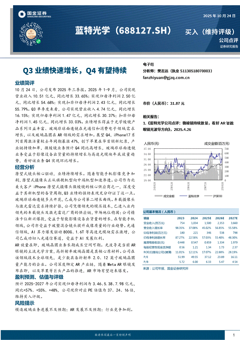 蓝特光学:国金证券-蓝特光学-688127-Q3业绩快速增长,Q4有望持续-251024