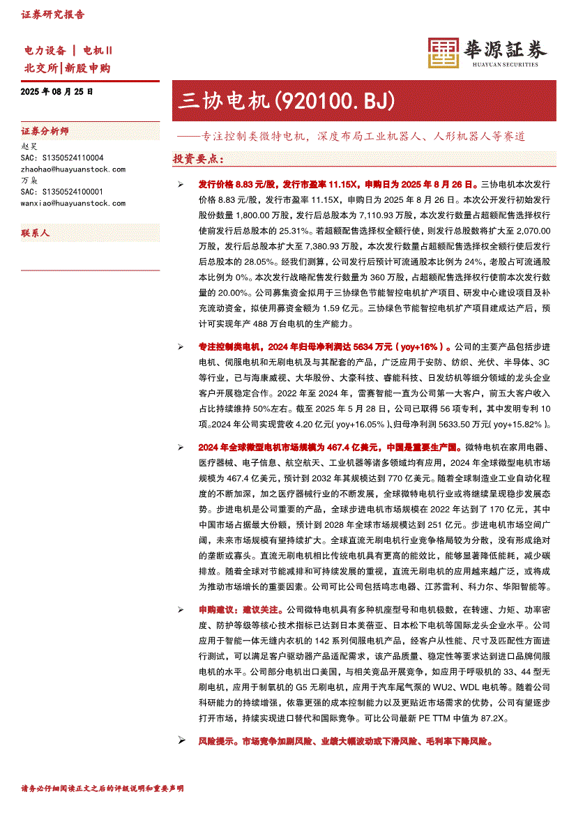 华源证券-三协电机(920100.BJ)新股申购:专注控制类微特电机,深度布局工业机器人、人形机器人等赛道-250825