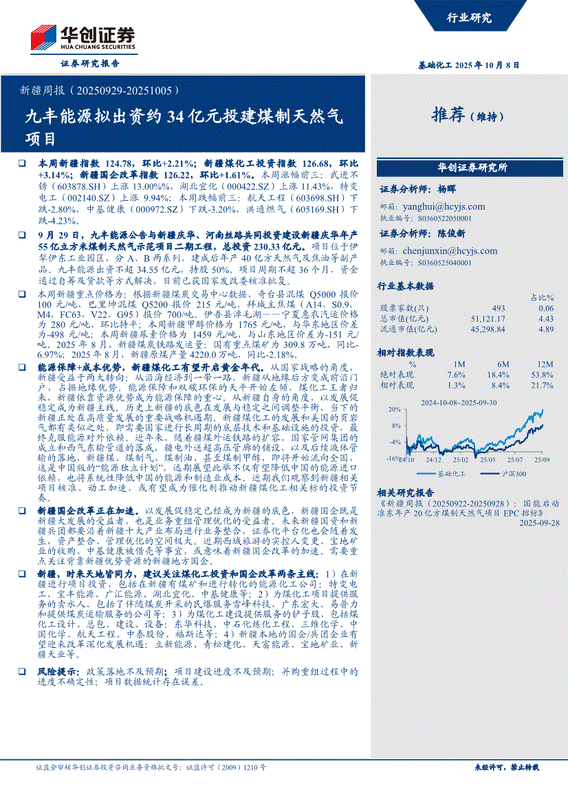 基础化工行业:华创证券-基础化工行业新疆周报:九丰能源拟出资约34亿元投建煤制天然气项目-251008