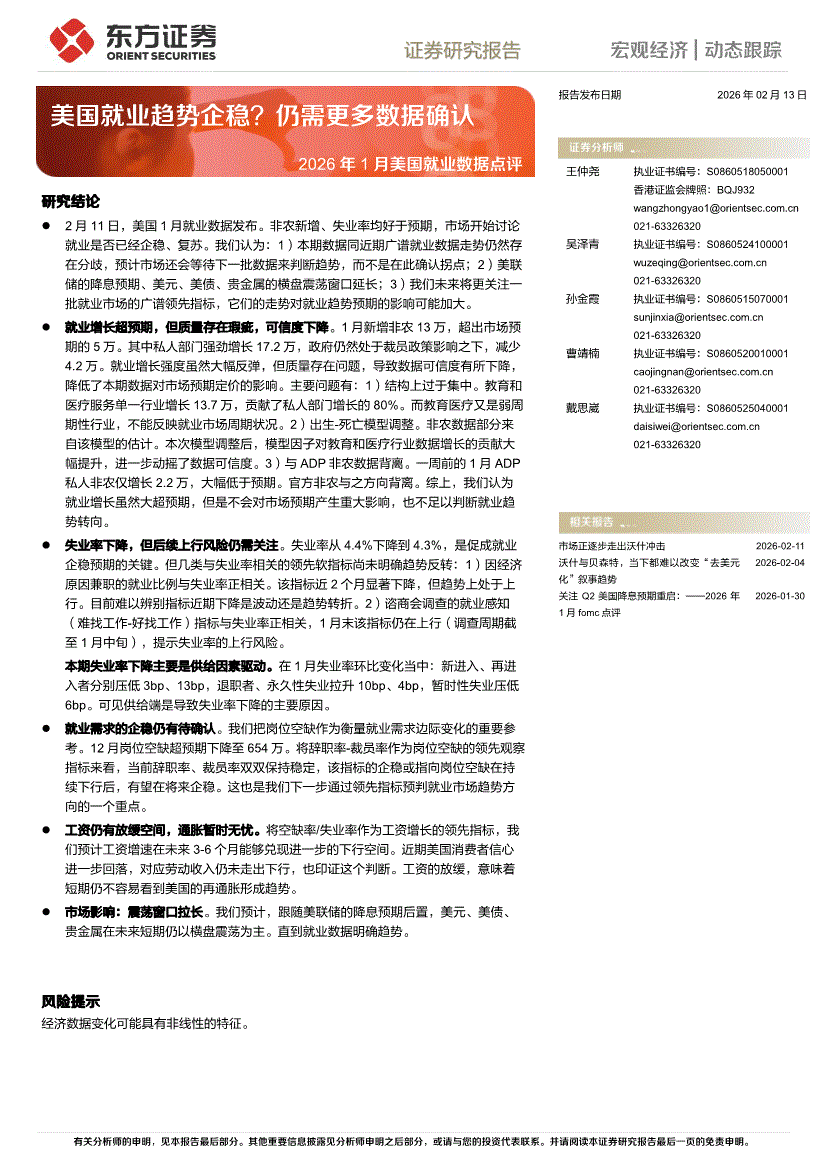 东方证券-2026年1月美国就业数据点评:美国就业趋势企稳?仍需更多数据确认-260213