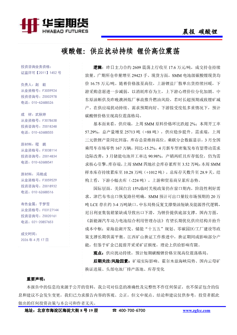 华宝期货-碳酸锂晨报:供应扰动持续,锂价高位震荡-260417