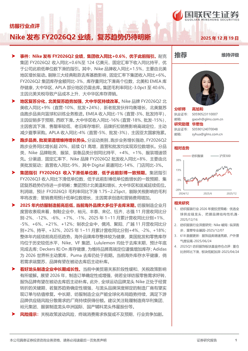 纺服行业:国联民生证券-纺服行业点评:Nike发布FY2026Q2业绩,复苏趋势仍待明晰-251219