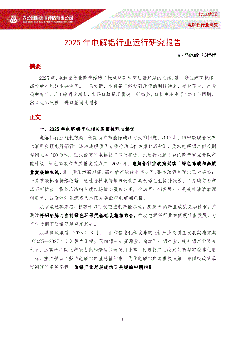 电解铝行业:大公国际-2025年电解铝行业运行研究报告-251216