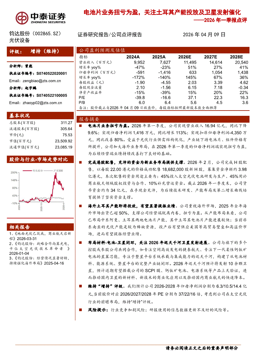 中泰证券-钧达股份-002865-2026年一季报点评:电池片业务扭亏为盈,关注土耳其产能投放及卫星发射催化-260409
