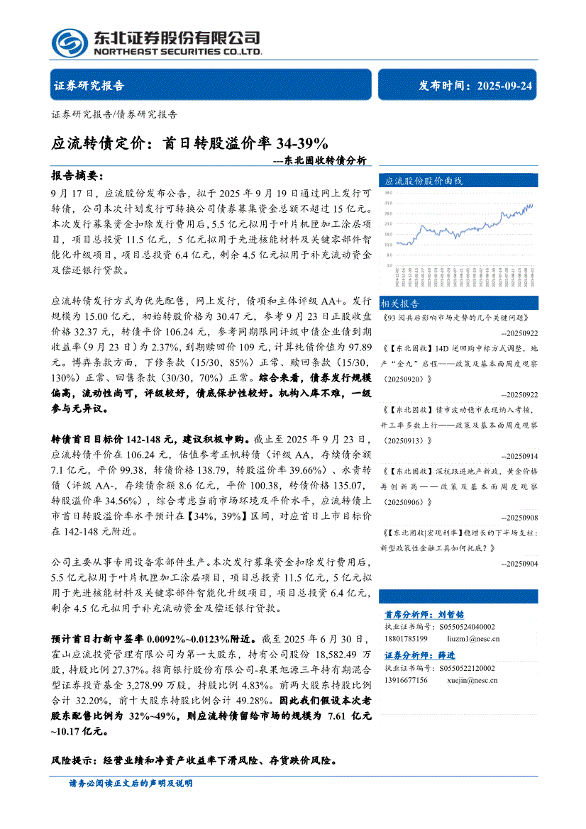 东北证券-东北固收转债分析:应流转债定价,首日转股溢价率34~39%-250924