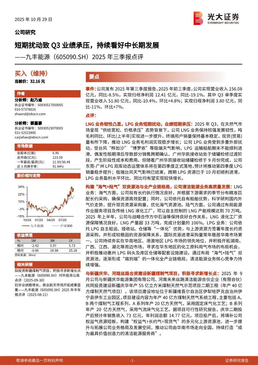 九丰能源:光大证券-九丰能源-605090-2025年三季报点评:短期扰动致Q3业绩承压,持续看好中长期发展-251029