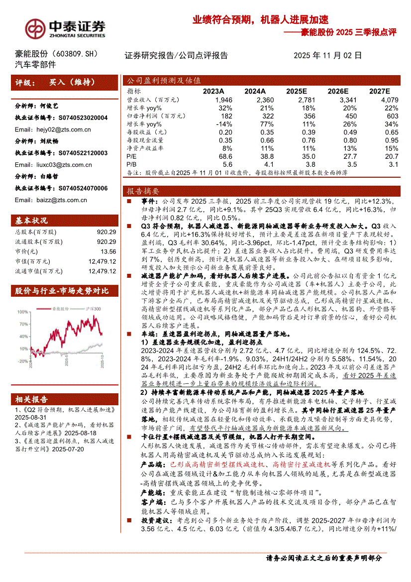豪能股份:中泰证券-豪能股份-603809-2025三季报点评:业绩符合预期,机器人进展加速-251102