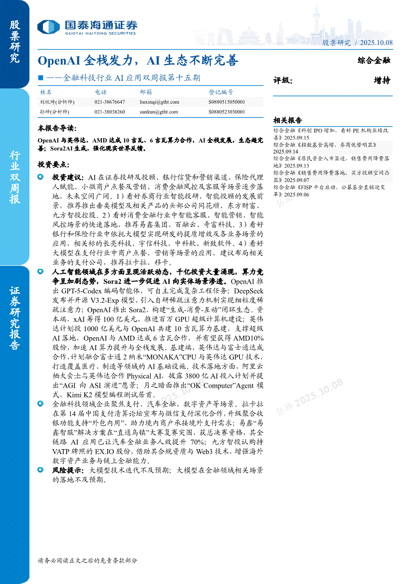 金融科技行业:国泰海通证券-金融科技行业AI应用双周报第十五期:OpenAI全栈发力,AI生态不断完善-251008