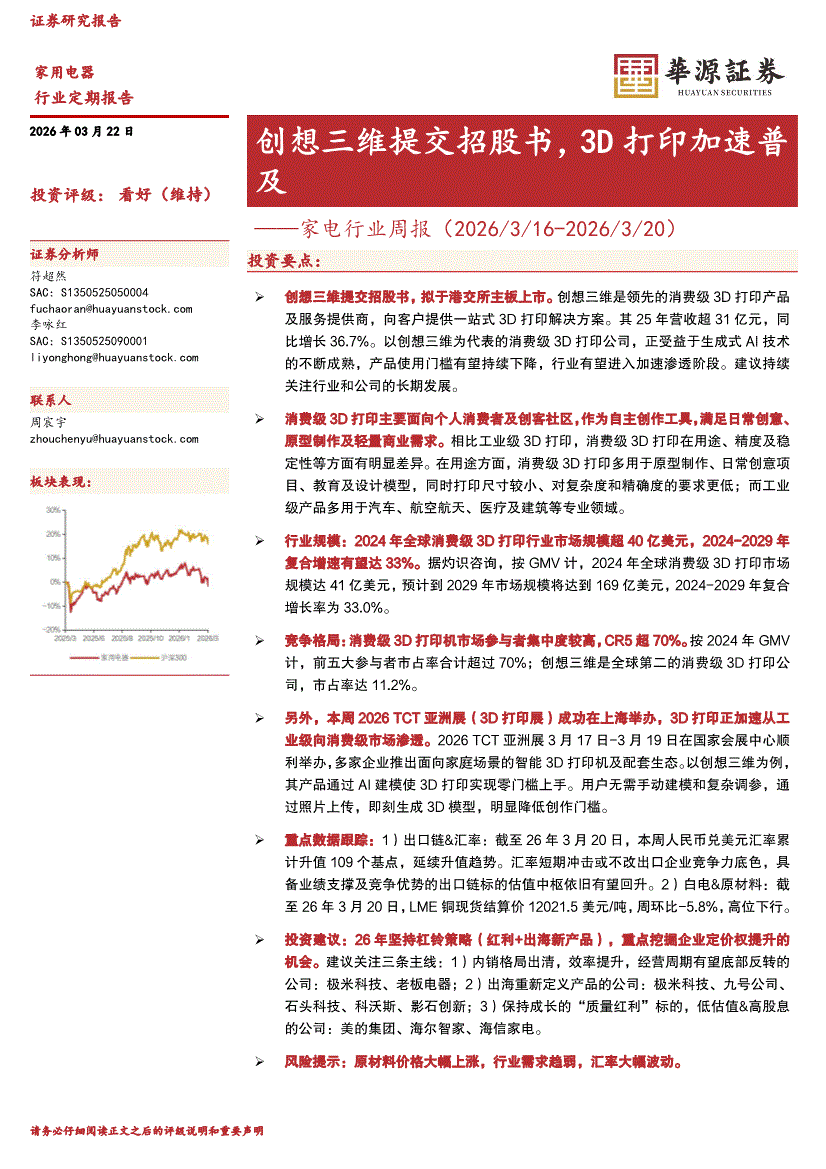 家电行业:华源证券-家电行业周报:创想三维提交招股书,3D打印加速普及-260322