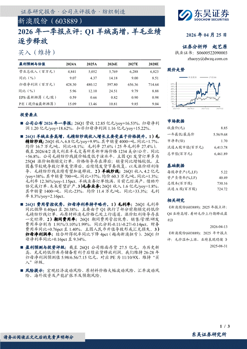 新澳股份:东吴证券-新澳股份-603889-2026年一季报点评:Q1羊绒高增,羊毛业绩逐步释放-260425