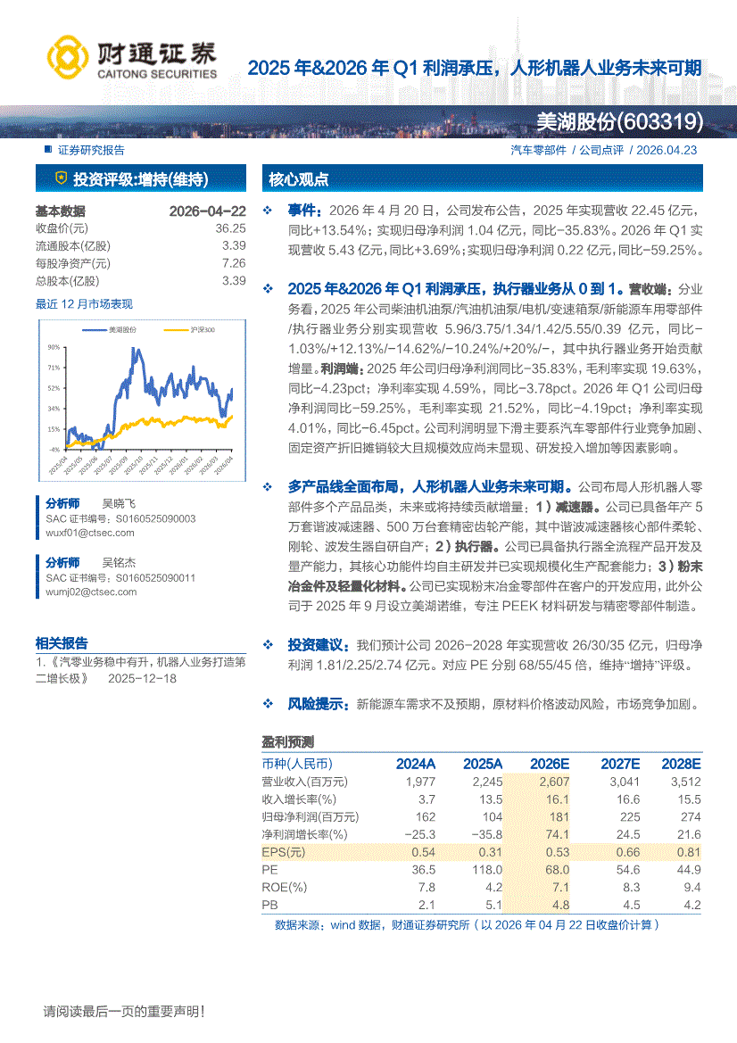 美湖股份:财通证券-美湖股份-603319-2025年&2026年Q1利润承压,人形机器人业务未来可期-260423