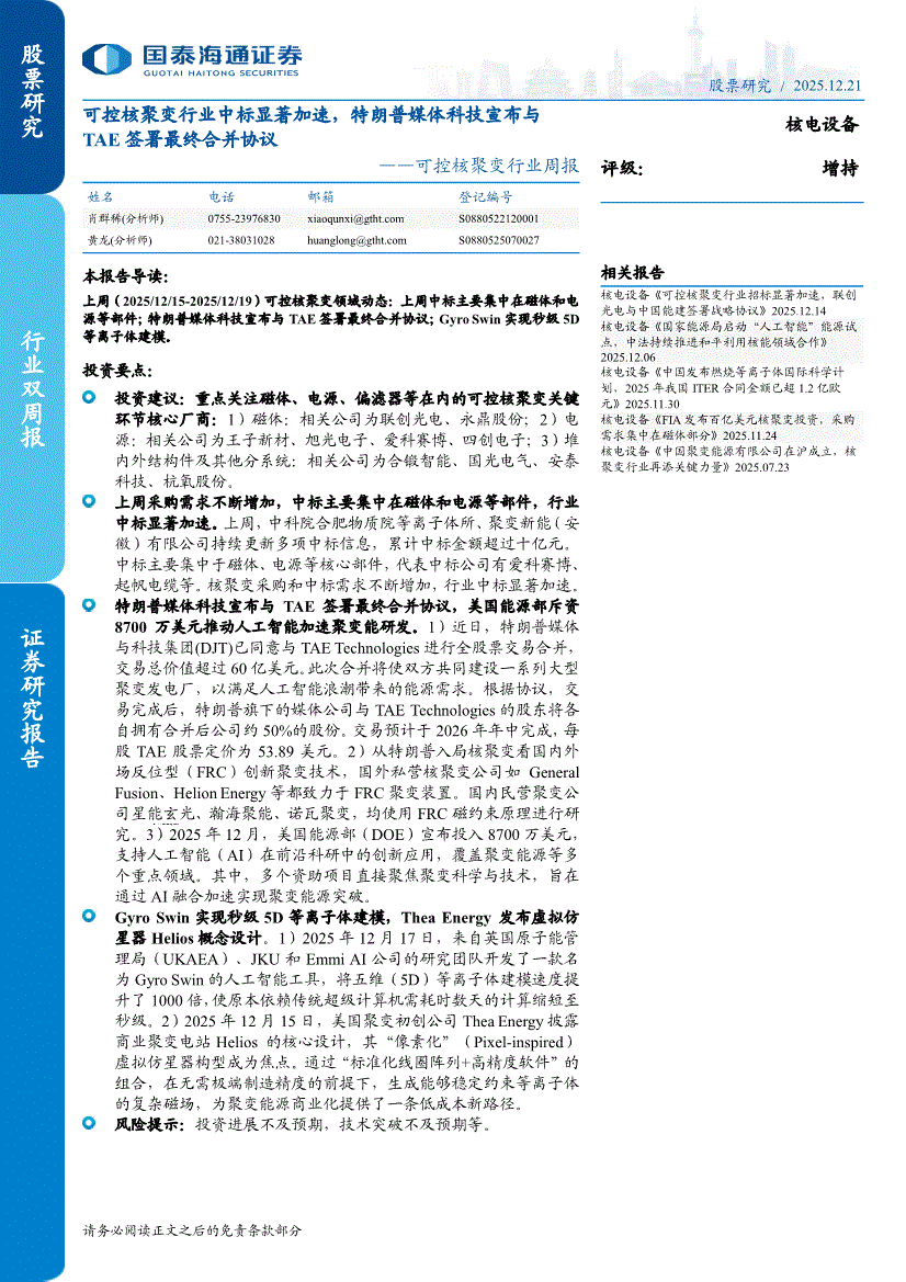 可控核聚变行业:国泰海通证券-可控核聚变行业周报:可控核聚变行业中标显著加速,特朗普媒体科技宣布与TAE签署最终合并协议-251221