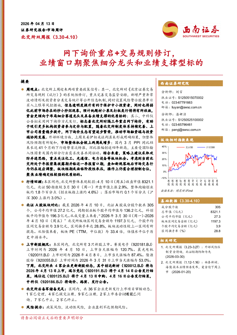 西南证券-北交所双周报:网下询价重启+交易规则修订,业绩窗口期聚焦细分龙头和业绩支撑型标的-260413