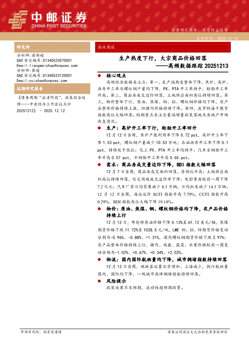 中邮证券-高频数据跟踪:生产热度下行,大宗商品价格回落-251215