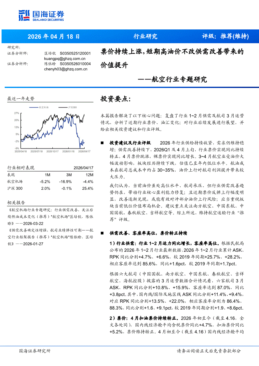 航空行业:国海证券-航空行业专题研究:票价持续上涨,短期高油价不改供需改善带来的价值提升-260418