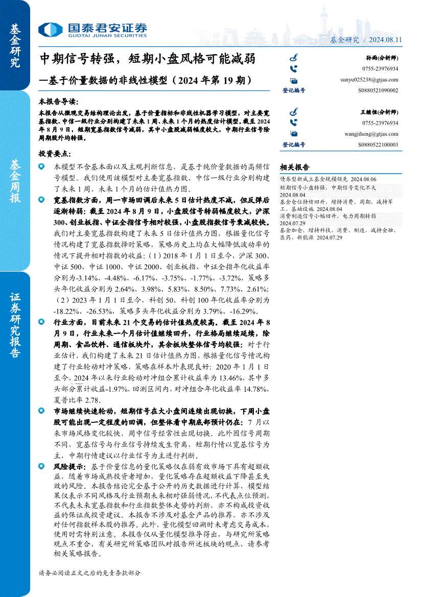 国泰君安-基金周报:基于价量数据的非线性模型(2024年第19期),中期信号转强,短期小盘风格可能减弱-240811