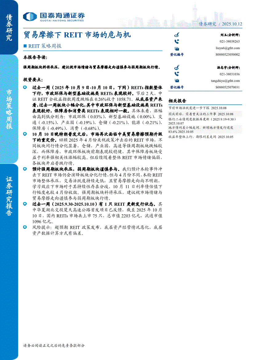 国泰海通证券-REIT策略周报:贸易摩擦下REIT市场的危与机-251012