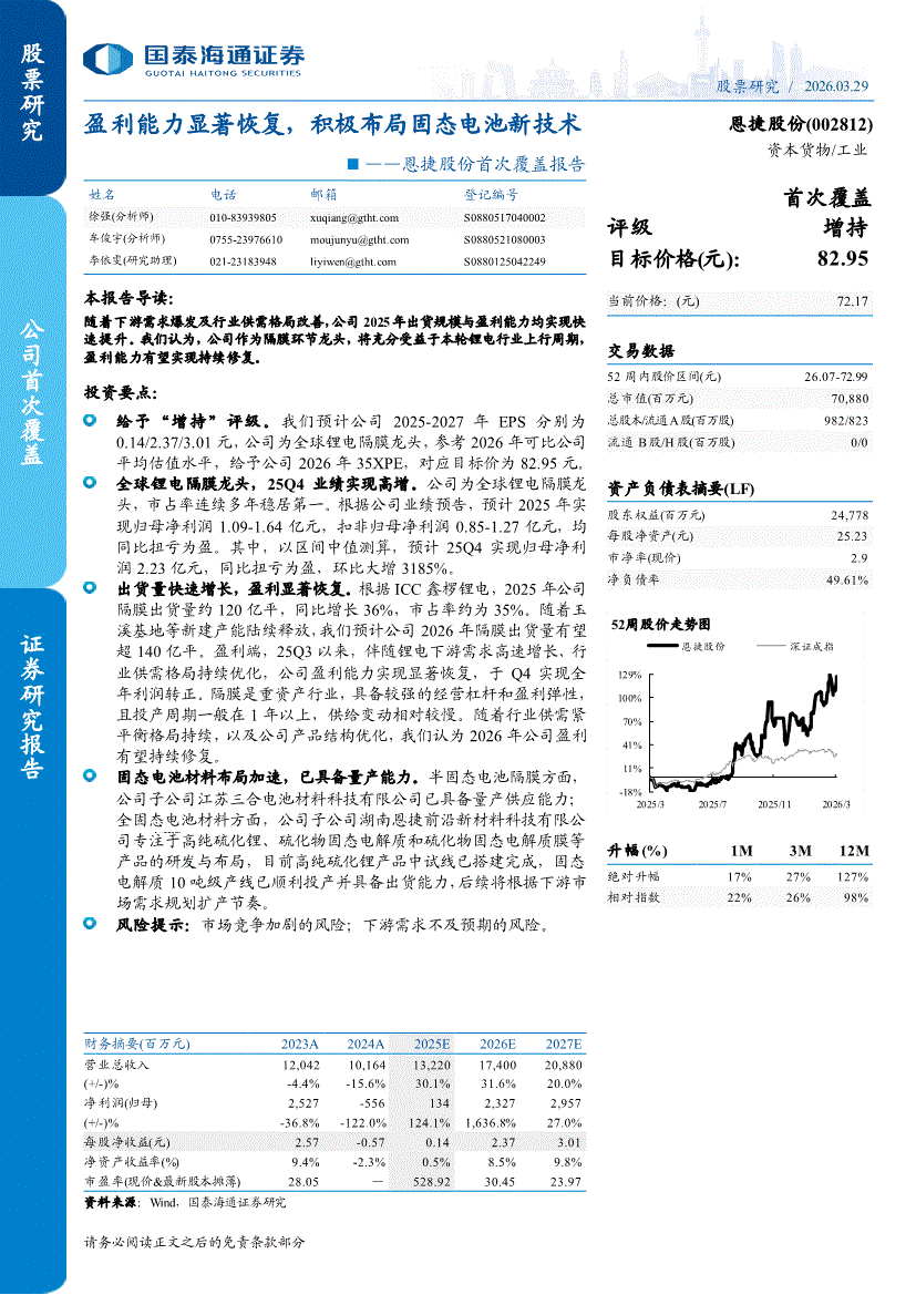 恩捷股份:国泰海通证券-恩捷股份-002812-首次覆盖报告:盈利能力显著恢复,积极布局固态电池新技术-260329