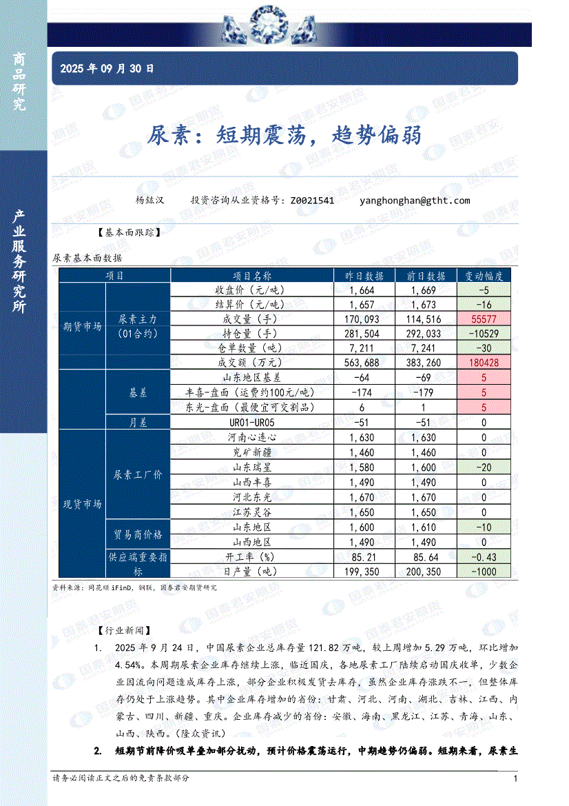 国泰君安期货-尿素:短期震荡,趋势偏弱-250930