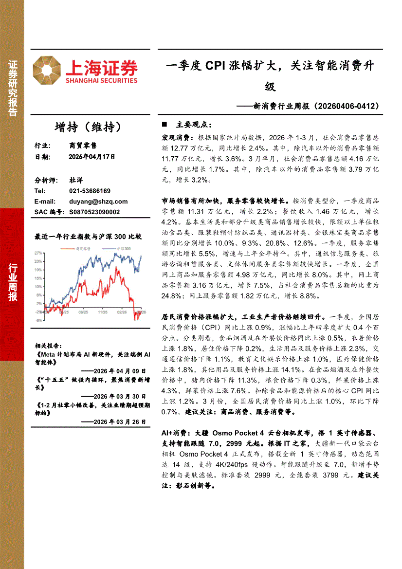 商贸零售行业:上海证券-商贸零售行业周报:一季度CPI涨幅扩大,关注智能消费升级-260417
