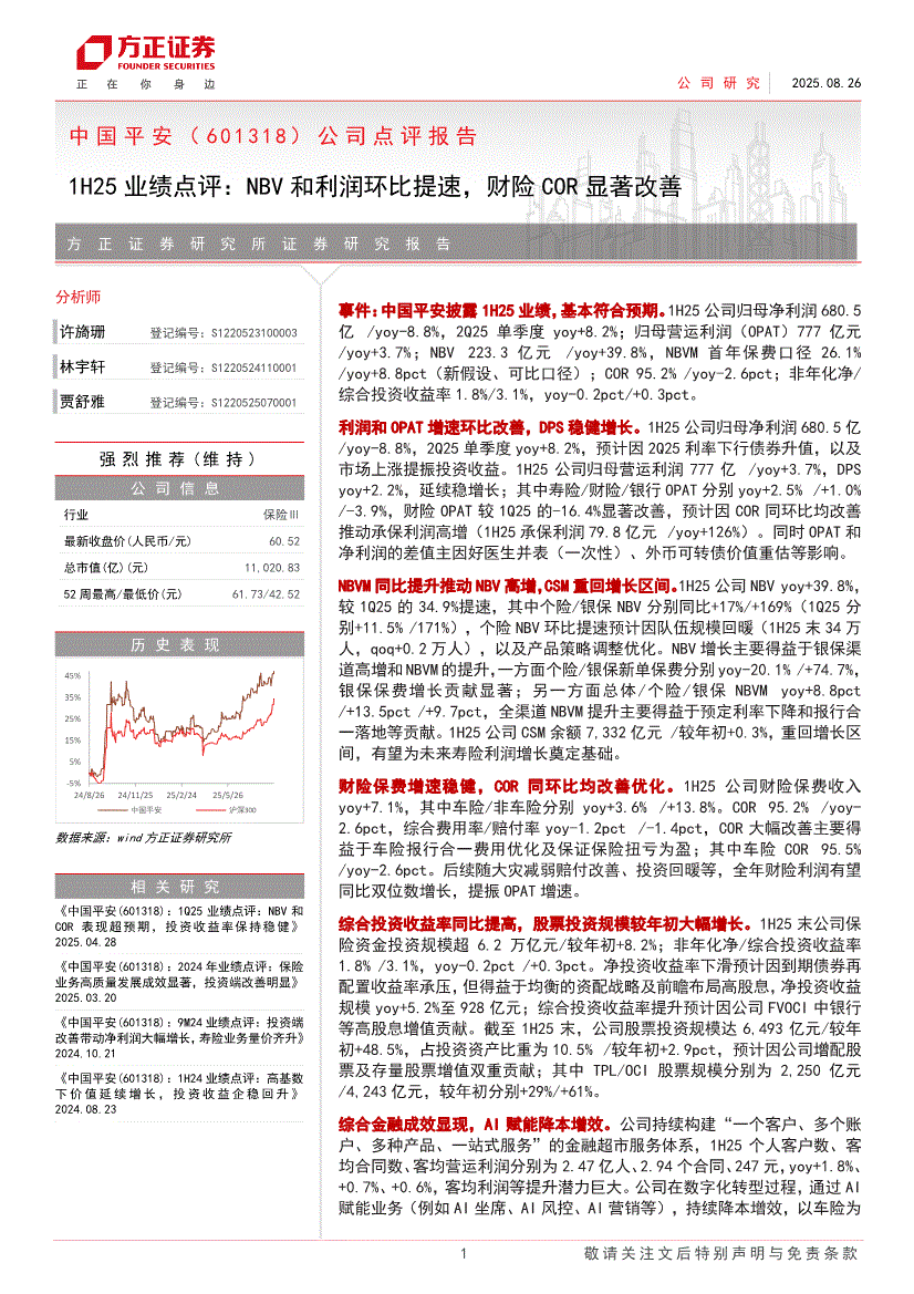 中国平安:方正证券-中国平安-601318-公司点评报告:1H25业绩点评,NBV和利润环比提速,财险COR显著改善-250826