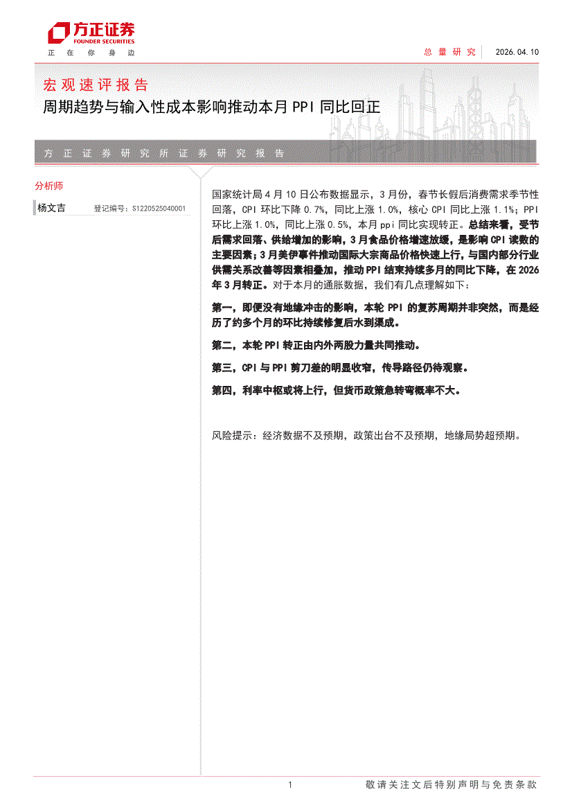 方正证券-宏观速评报告:周期趋势与输入性成本影响推动本月PPI同比回正-260410