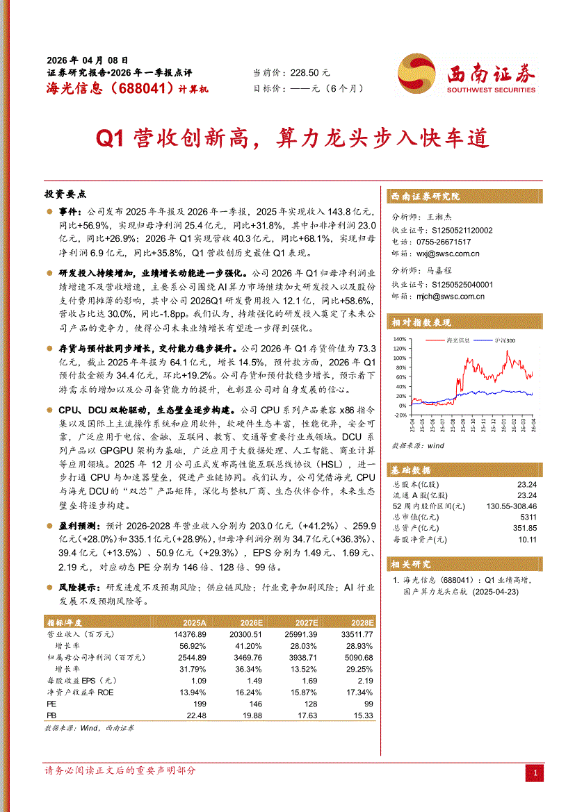 海光信息:西南证券-海光信息-688041-Q1营收创新高,算力龙头步入快车道-260408