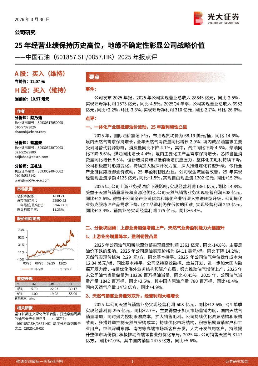 中国石油:光大证券-中国石油-601857-2025年报点评:25年经营业绩保持历史高位,地缘不确定性彰显公司战略价值-260330