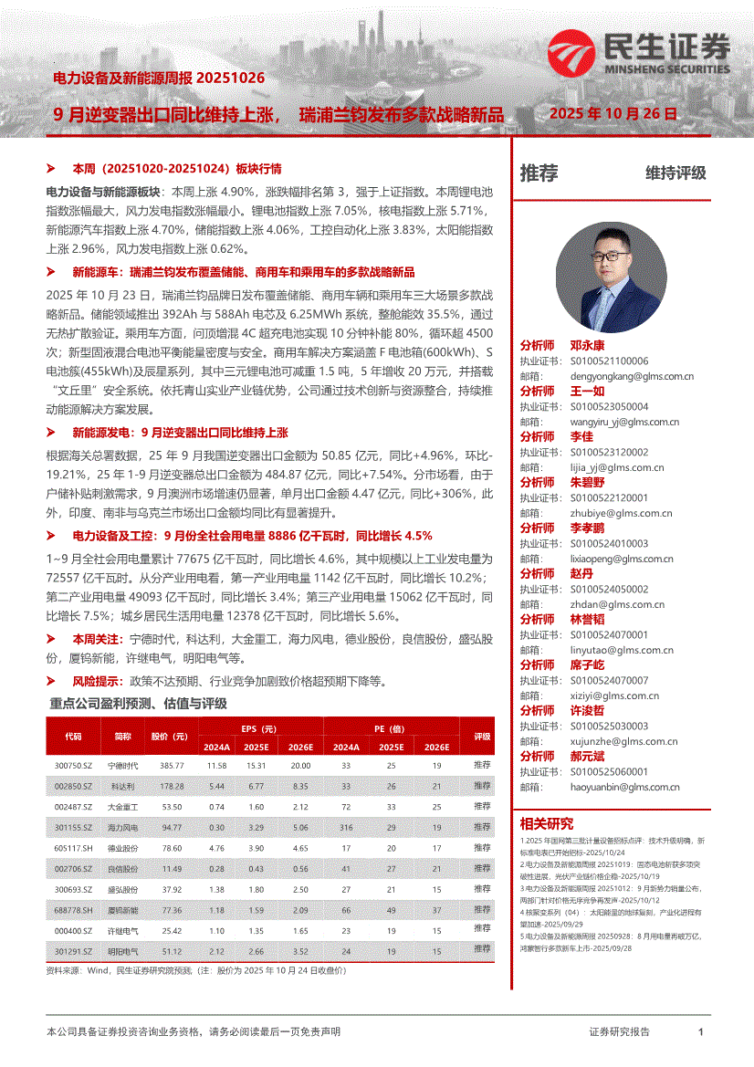 电力设备及新能源行业:民生证券-电力设备及新能源行业周报:9月逆变器出口同比维持上涨,瑞浦兰钧发布多款战略新品-251026