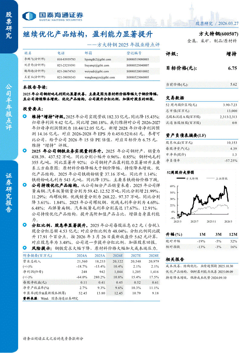 方大特钢:国泰海通证券-方大特钢-600507-2025年报业绩点评:继续优化产品结构,盈利能力显著提升-260327