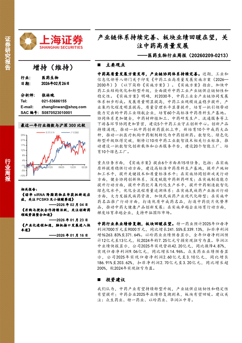 医药生物行业:上海证券-医药生物行业周报:产业链体系持续完善、板块业绩回暖在望,关注中药高质量发展-260226