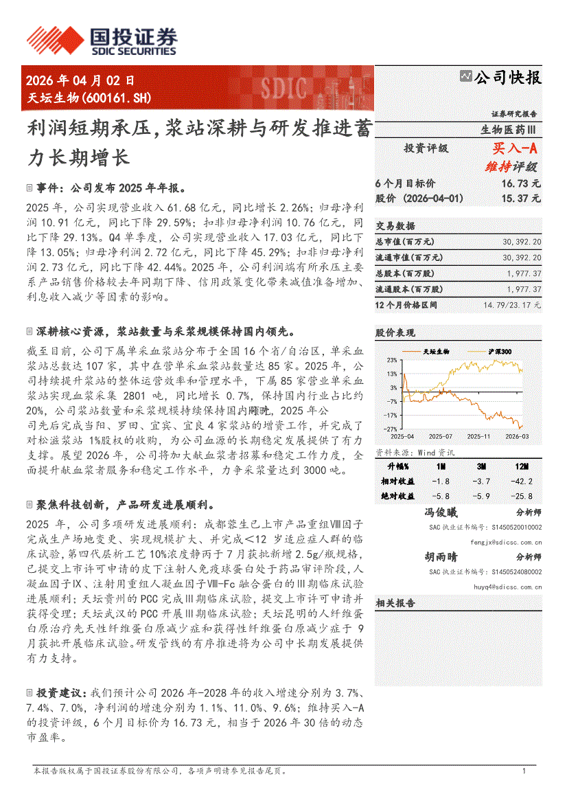 天坛生物:国投证券-天坛生物-600161-利润短期承压,浆站深耕与研发推进蓄力长期增长-260402