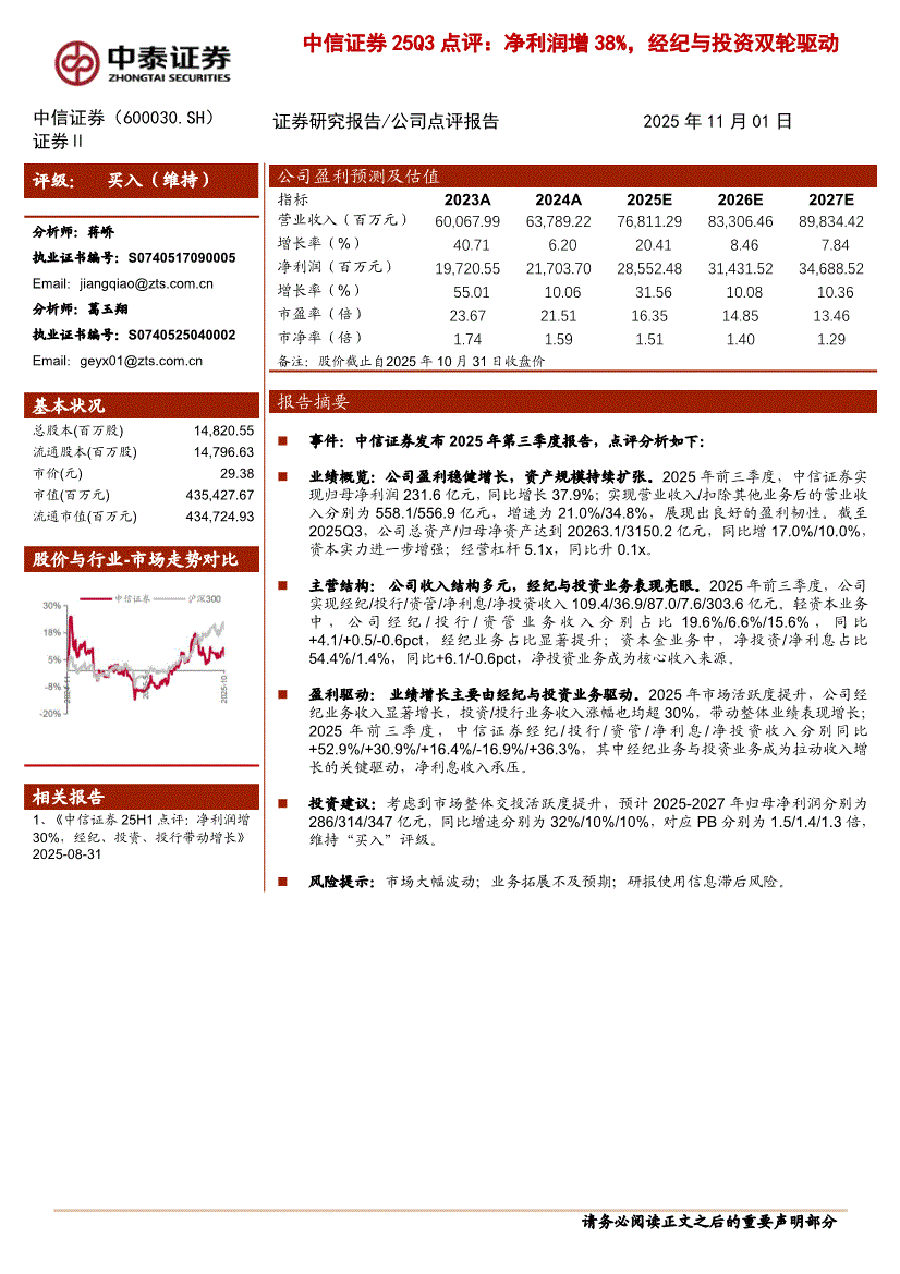 中信证券:中泰证券-中信证券-600030-25Q3点评:净利润增38%,经纪与投资双轮驱动-251101