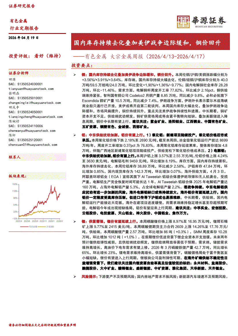 华源证券-有色金属行业大宗金属周报:国内库存持续去化叠加美伊战争边际缓和,铜价回升-260419