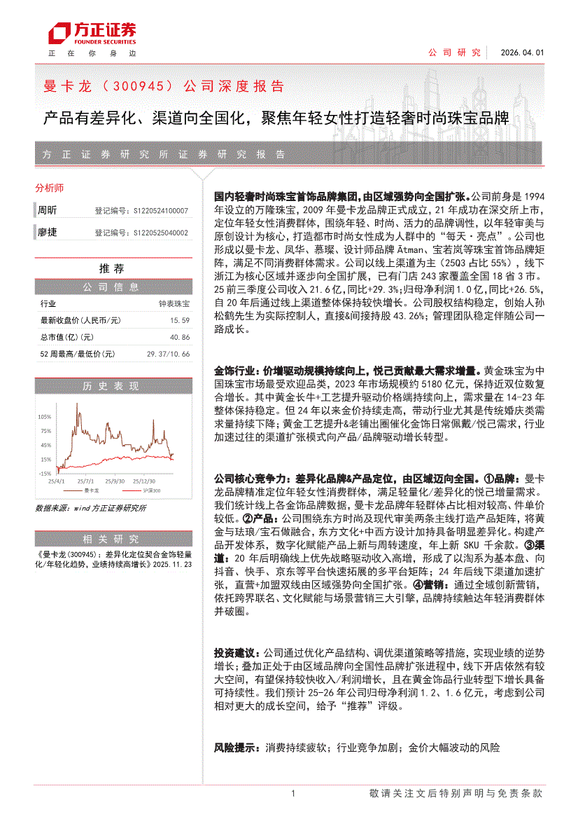 曼卡龙:方正证券-曼卡龙-300945-公司深度报告:产品有差异化、渠道向全国化,聚焦年轻女性打造轻奢时尚珠宝品牌-260401