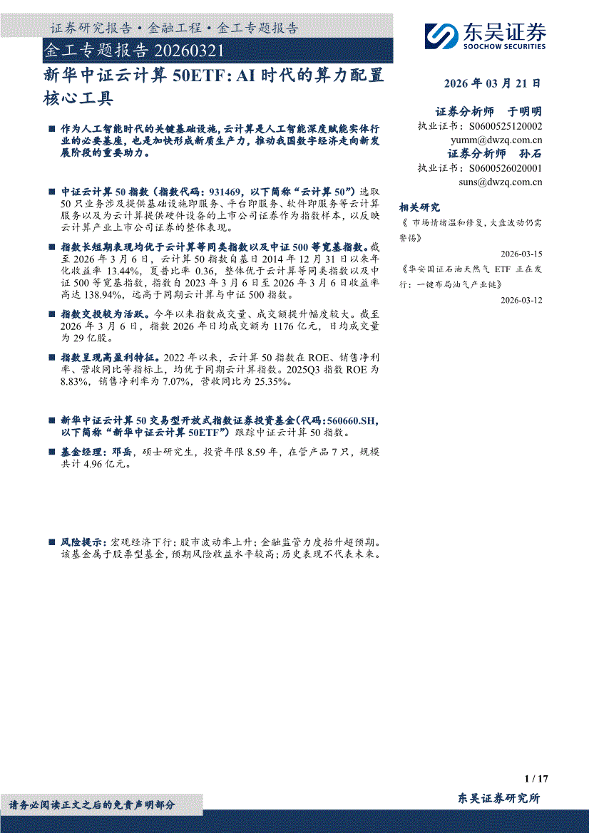 东吴证券-金工专题报告:新华中证云计算50ETF,AI时代的算力配置核心工具-260321