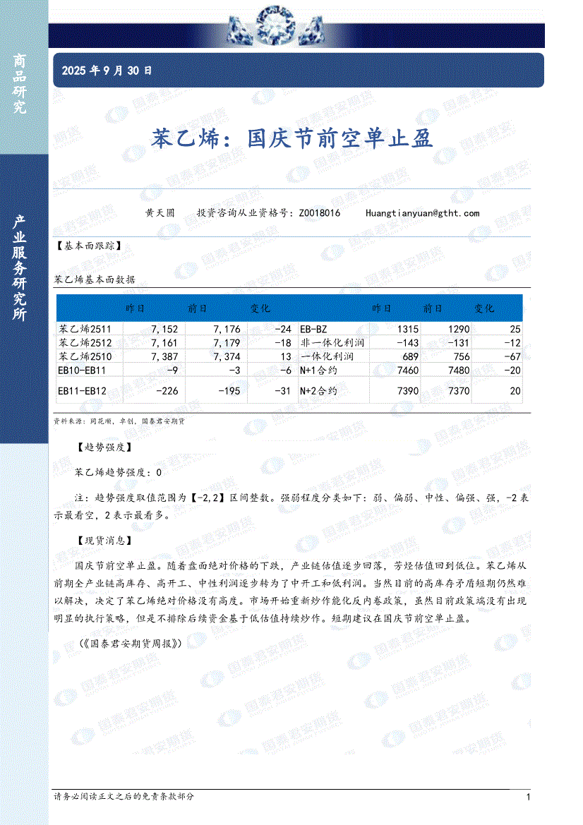 国泰君安期货-苯乙烯:国庆节前空单止盈-250929