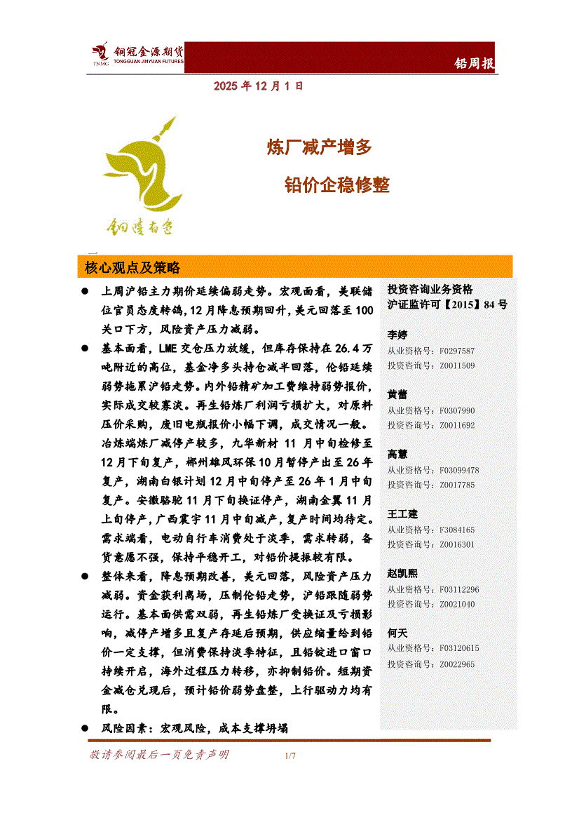 铜冠金源期货-铅周报:炼厂减产增多,铅价企稳修整-251201