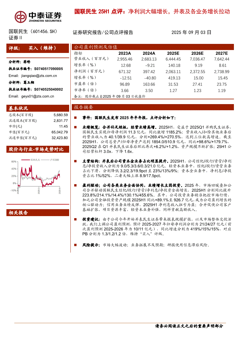 国联民生:中泰证券-国联民生-601456-25H1点评:净利润大幅增长,并表及各业务增长拉动-250903