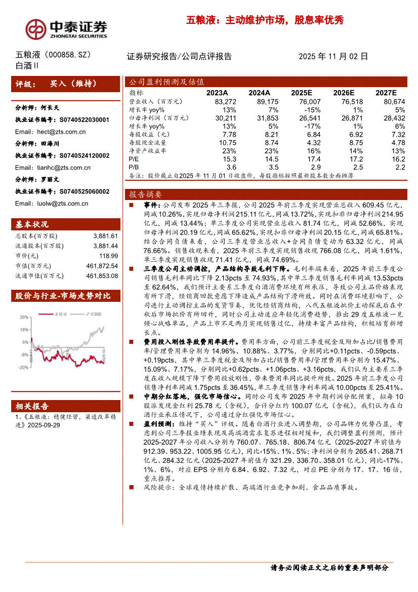 五粮液:中泰证券-五粮液-000858-主动维护市场,股息率优秀-251102