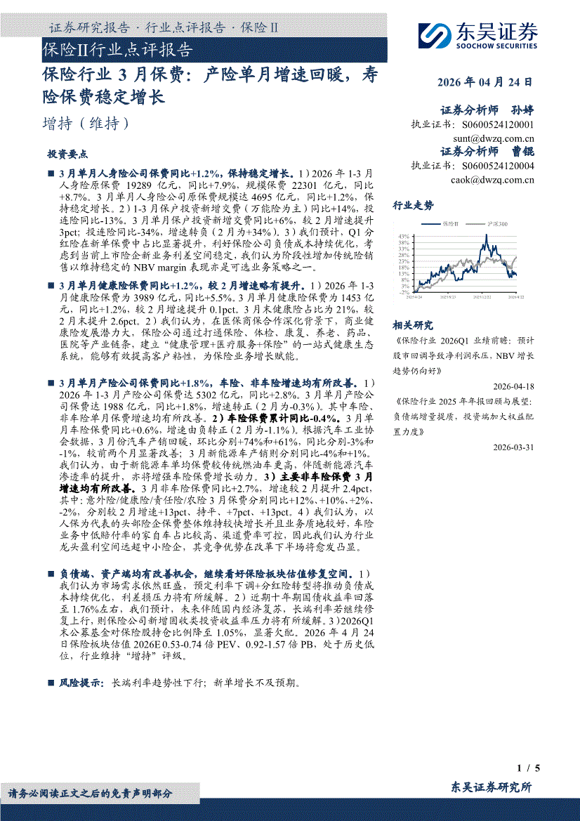 保险行业:东吴证券-保险行业3月保费:产险单月增速回暖,寿险保费稳定增长-260424