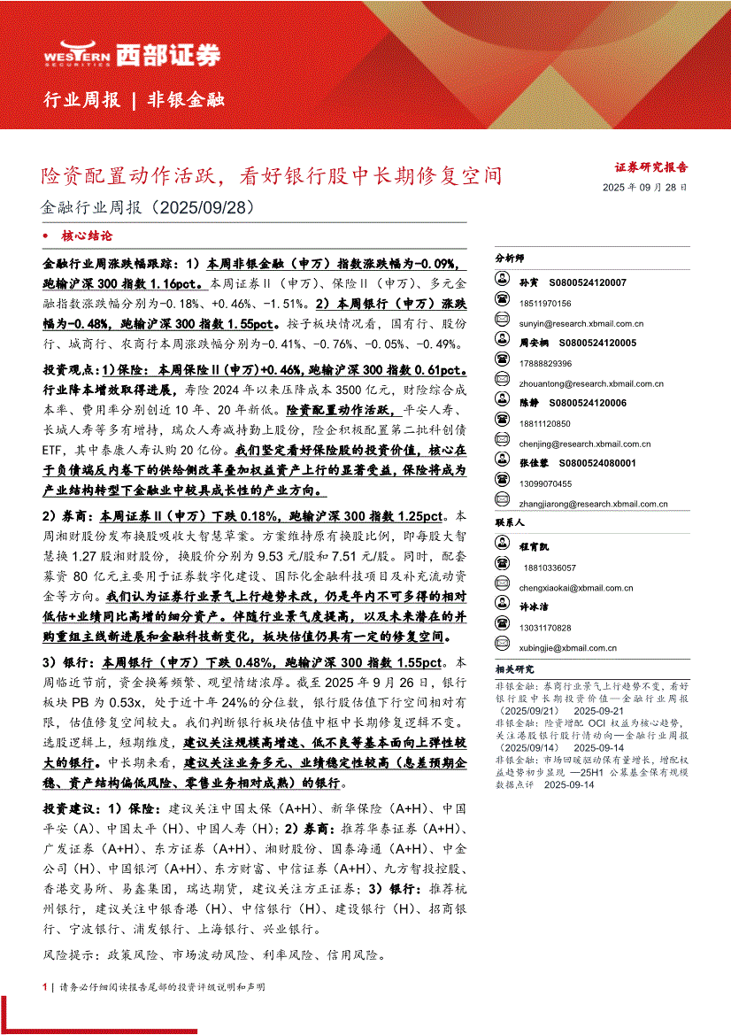 金融行业:西部证券-金融行业周报:险资配置动作活跃,看好银行股中长期修复空间-250928