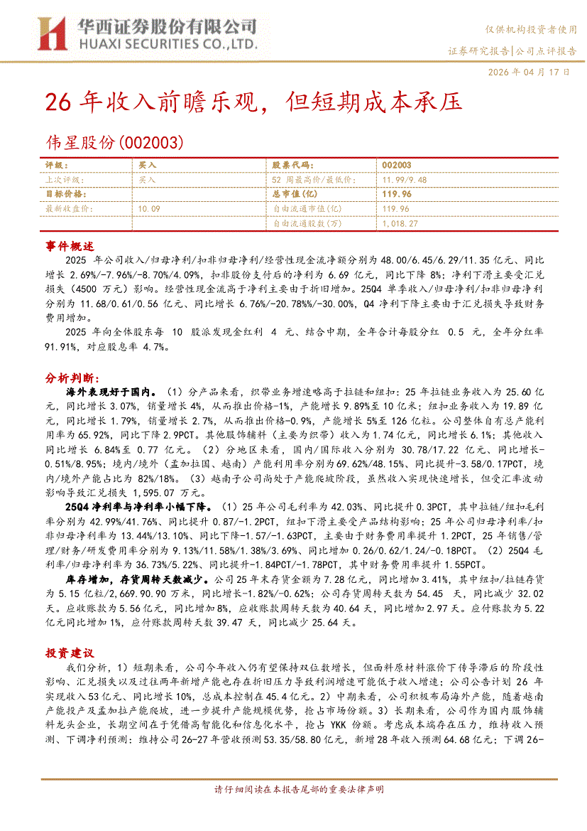 华西证券-伟星股份-002003-26年收入前瞻乐观,但短期成本承压-260417
