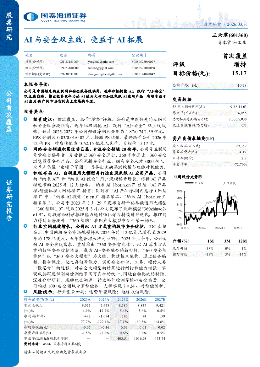 三六零:国泰海通证券-三六零-601360-AI与安全双主线,受益于AI拓展-260331