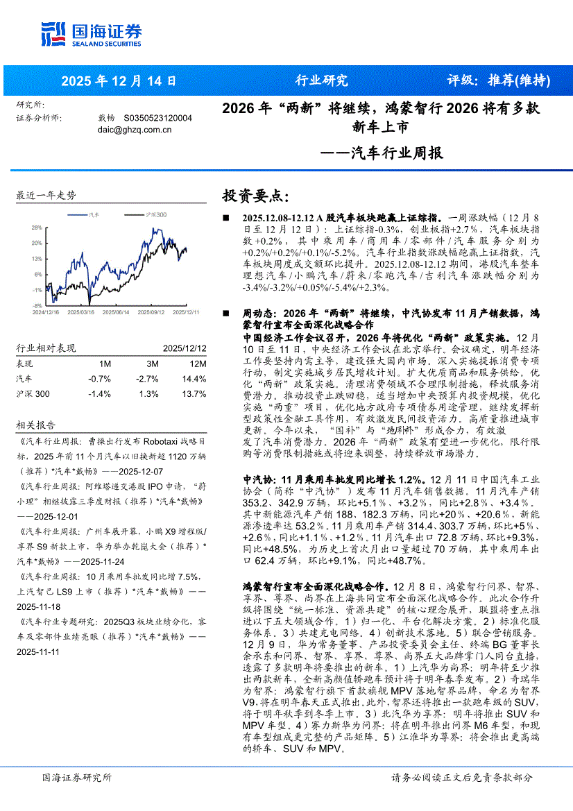 汽车行业:国海证券-汽车行业周报:2026年“两新”将继续,鸿蒙智行2026将有多款新车上市-251214