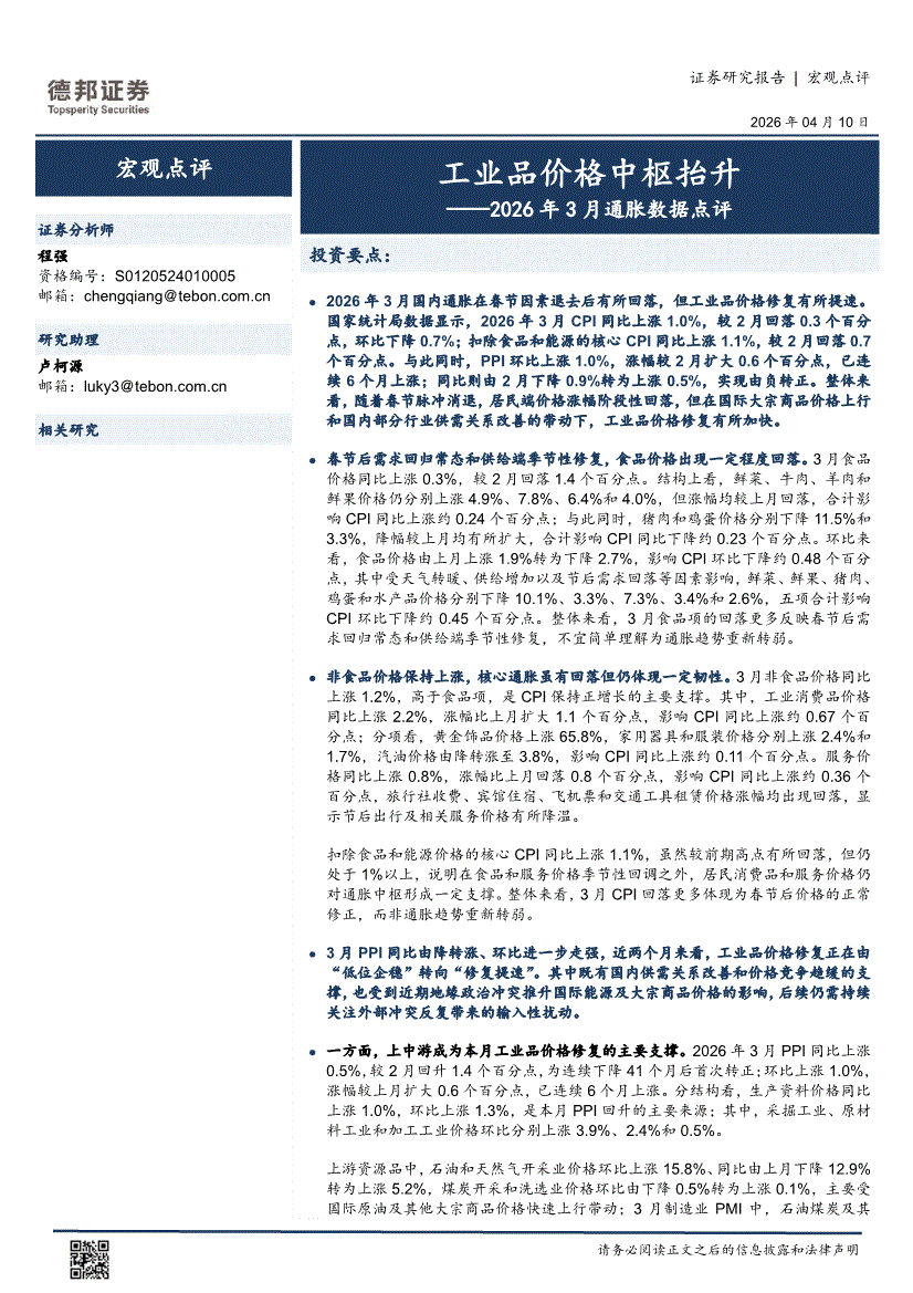 德邦证券-2026年3月通胀数据点评:工业品价格中枢抬升-260410