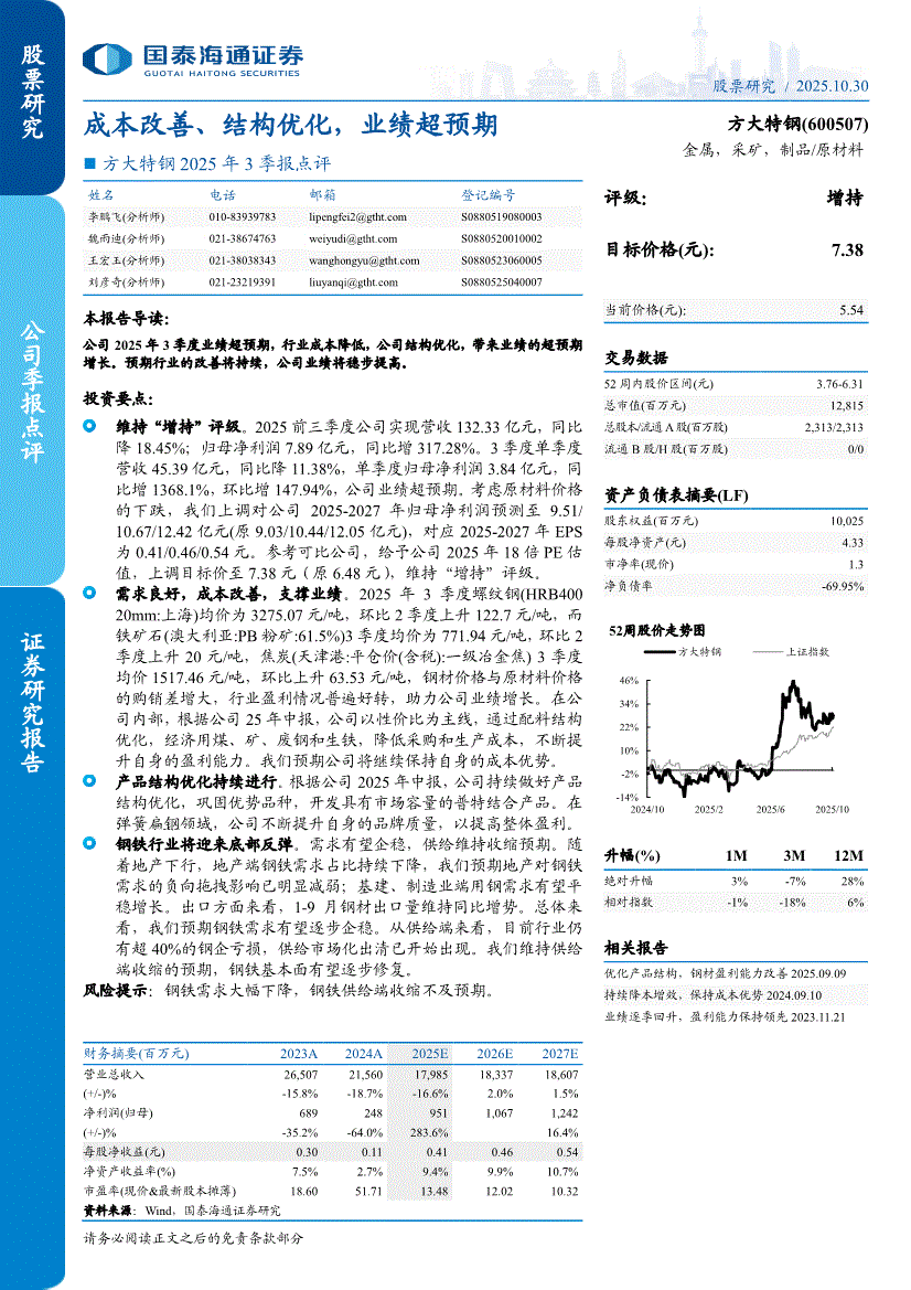 方大特钢:国泰海通证券-方大特钢-600507-2025年3季报点评:成本改善、结构优化,业绩超预期-251030
