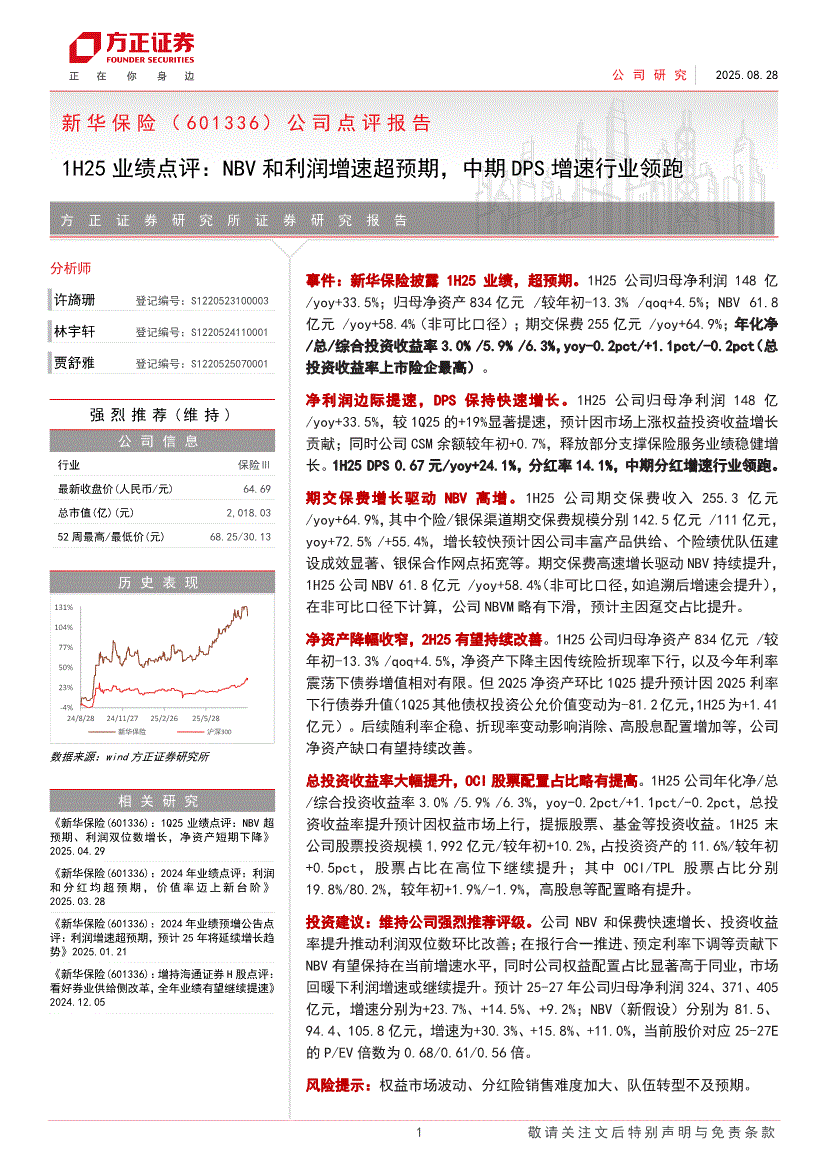 新华保险:方正证券-新华保险-601336-公司点评报告:1H25业绩点评,NBV和利润增速超预期,中期DPS增速行业领跑-250828