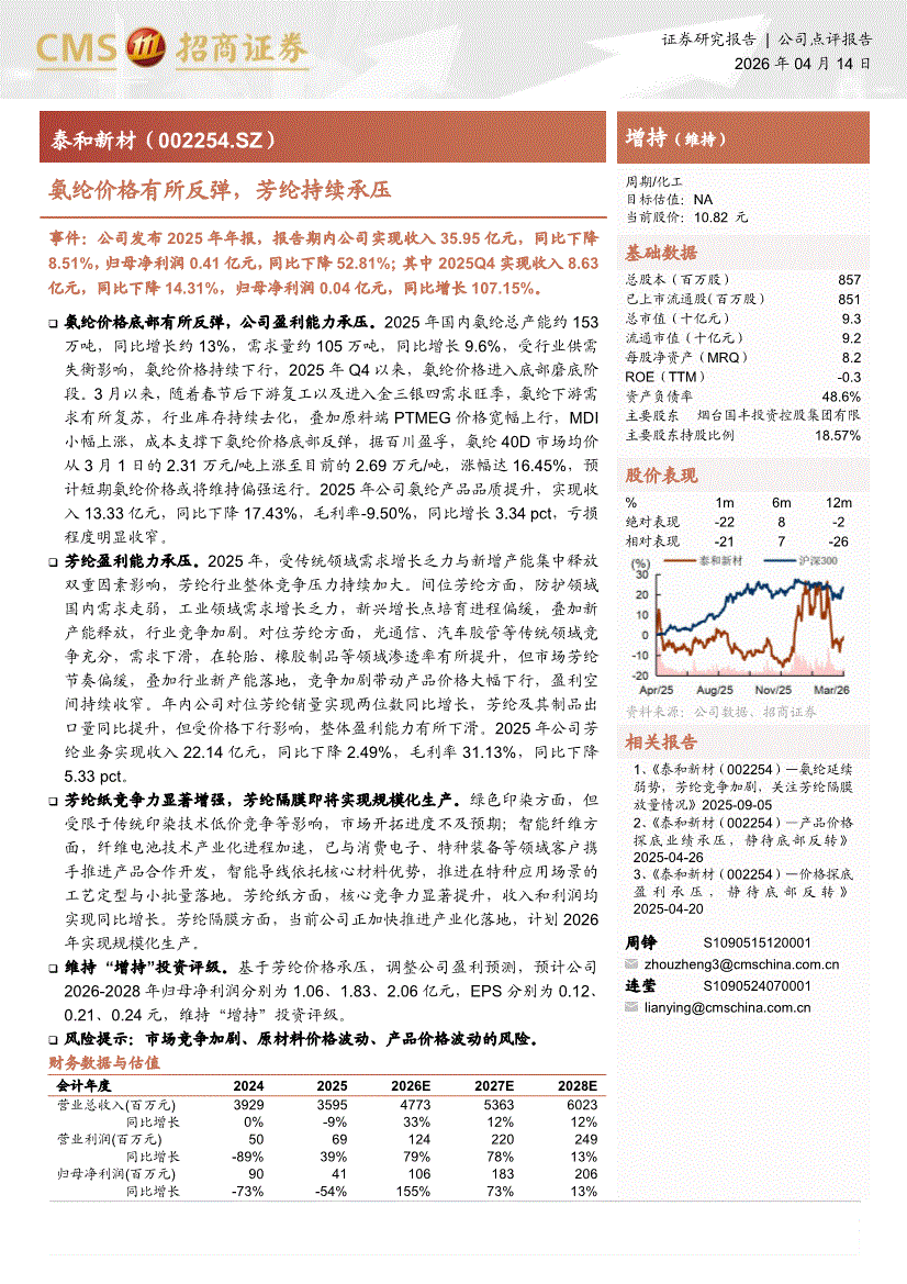泰和新材:招商证券-泰和新材-002254-氨纶价格有所反弹,芳纶持续承压-260414