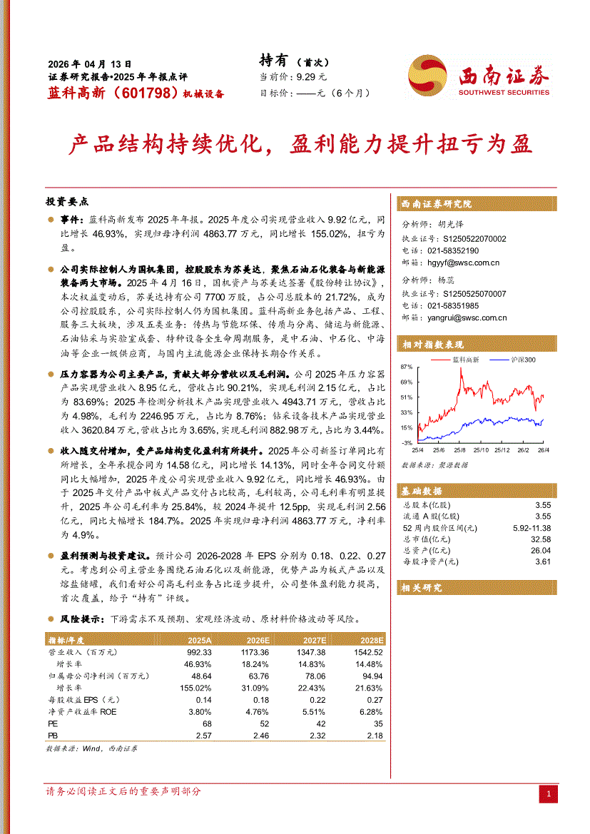 蓝科高新:西南证券-蓝科高新-601798-产品结构持续优化,盈利能力提升扭亏为盈-260413